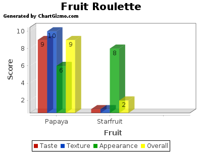I've learned that life doesn't need to be flamboyant or extravagant to be exciting and enjoyable. Adventure comes in all shapes and sizes, most of them legal. If you're having a boring day, or a dull week, do something different, something small that you haven't done before. So try some food you haven't before, or do something different with your hair or clothes, or wear a dress if you haven't in a long time, or jump in a puddle, or buy something small for someone else. It'll make you smile.Today, I tasted papaya fir the first time ever. It was a mostly insignificant thing to do, but it was new and different. Fruit Roulette might become a regular thing!